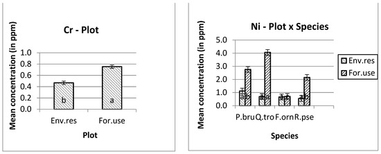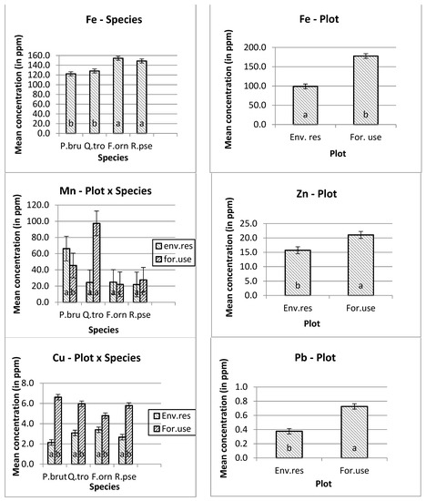 The higher manganese (Mn) and nickel (Ni) mean concentrations were measured in Quercus trojana’s leaves, and the higher copper (Cu) concentration was measured in Pinus brutia’s leaves at the forestry use plot. In addition, the higher concentrations of iron (Fe), zinc (Zn), chromium (Cr) and lead (Pb) were measured at the forestry use plot. Furthermore, the higher concentration of iron (Fe) was measured on the leaves of Fraxinus ornus trees (Figure 1).