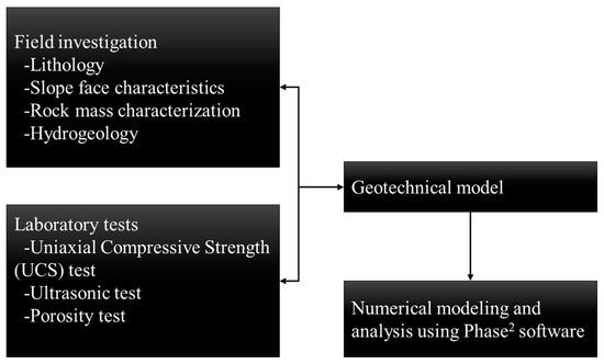 This work is part of an ongoing slope design analysis. The field investigation and laboratory tests have previously been done. The scope of this work involves numerical modeling and analysis of stability condition of the quarry slopes under the effects of seepage of ocean waters. The workflow process is as shown in Figure 3.
