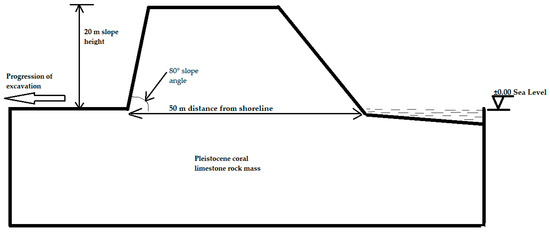 In this work, a model of the high-grade limestone region suffices for simulation based on the objective of the study. The regions with weathered rock and coral sand are not considered in this study, since they happen to form the topmost layers of the rock mass and are not in contact with ocean water. The model boundary in Figure 5 guides the development of the geometry of the geomechanical prototype for this analysis. The model geometries are quite simple, so they were generated by entering coordinates directly into the user interface. The analysis considers slopes at excavation depths of 20 m, 30 m, 40 m, and 50 m, with varying distances of 50 m, 75 m, and 100 m from the shoreline.