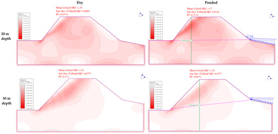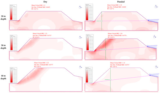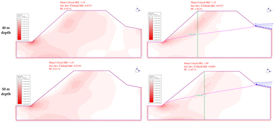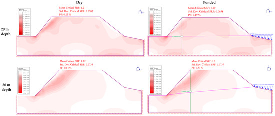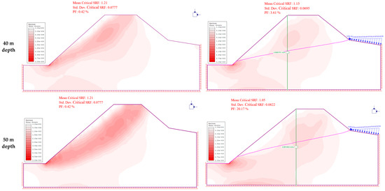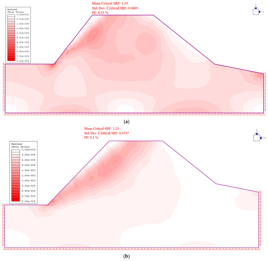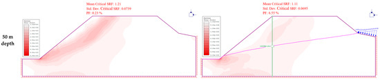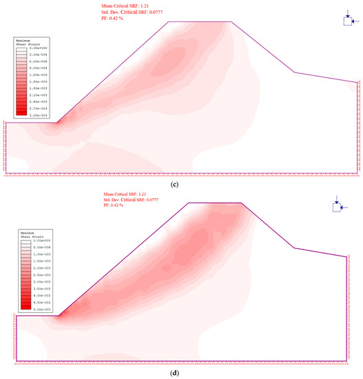 The analysis also incorporated the probability of failure analysis. The graph of safety factor and probability of failure against slope angle in Figure 8 shows that the probability of failure is high for steep slope angles above 60°, after which it significantly reduces when the safety factor is ≥1. In the discussion on slope stability-acceptance criteria for open cast mine design, Adams [29] and Tapia et al. [30] outline the various acceptable failure probabilities as dependent on the slope scale (either bench, inter-ramp, or overall slope) and level of severity of the consequences of failure (low, medium, or high). The allowable probability of failure (PF) in this study is ≤10%. All optimized slope angles meet the criteria for allowable probability of failure, being less than 10%. With the optimum slope angles achieved for various depths, the nephograms of shear strain show a significant reduction in strains at the slope toe. The stable slopes have shear planes lying deep within the slope along non-circular failure surfaces through the slope toe. As the excavation depth increases, the strains on the slope toe generally increase, and this can be attributed to the overlying weight of the slope. A combination of the two parameters, i.e., safety factor and probability of failure, thus, gives a robust design judgment.
