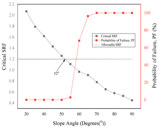 Graph of slope angle vs. strength reduction factor (FSRF) and probability of failure (PF).
