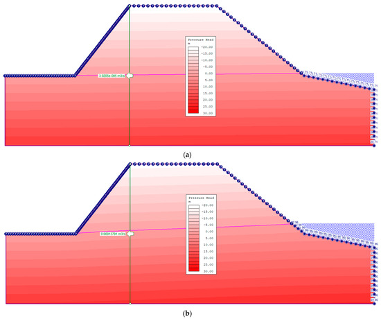 Pore pressure within the slopes at low and high tides (20 m excavation depth 50 m from shoreline). (a) Low tide level 0.71 m; (b) high tide level 2.96 m.