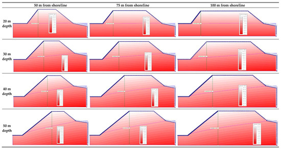 Optimized slope angles for various excavation depths at 50 m distance from the shoreline. (a) 20 m depth, 52° slope angle; (b) 30 m depth, 46° slope angle; (c) 40 m depth, 42° slope angle; (d) 50 m depth, 39° slope angle.
