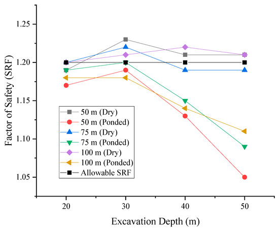 The optimum slope angle of 52° corresponding to a safety factor of 1.2 was obtained for an excavation depth of 20 m at 50 m from the shoreline. Following the optimization of the slope angle at 20 m excavation depth, the other slopes at deeper excavations were determined from a smaller range of trials. Optimum slope angle for each excavation depth was determined by starting from the slope angle of the prior excavation depth, then reducing the slope angle till the angle corresponding to a safety factor of 1.2 was attained. The overall slope angles for various excavation depths were as follows: 46° for 30 m depth, 42° for 40 m depth, and 39° for 50 m depth, all at 50 m distance from the shoreline, as shown in Figure 8.