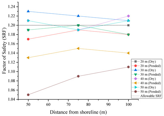 The stability analysis also incorporated the statistical analysis function of Phase 2 to evaluate the slope probability of failure (PF). The PF is generated by the analysis software when the statistical option is selected in project settings. A standard deviation is set for material properties to allow the statistical calculation. From Figure 8, the probability of failure is high for steep slope angles between 90° and 60°, after which it significantly reduces when the safety factor is ≥1. The graph gives a good visual impression of the stability of the slope, in that even when the safety factor is high, the steep slope angles present high probabilities of failure. In the dry condition, there is no significant difference in slope angle relative to distance from the shoreline. The data in Table 2 were used to plot the graph of variation of safety factor with slope angles, as shown in Figure 9.