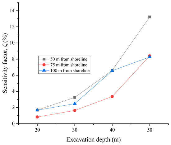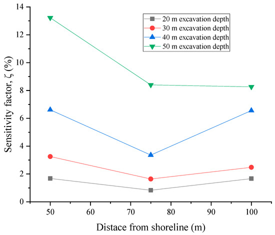 A parametric analysis was conducted on the variation in ocean-water seepage with excavation depth and distance from the shoreline. The nephograms in Figure 11 show the various pore pressure plots. At the same distance from the shoreline, the pore pressure in the slope and discharge velocity increase with increasing excavation depth. On the other hand, when the excavation depth is held constant, the discharge velocity decreases with increasing distance from shoreline and the pore pressure intensity also reduces. An observation of the trend of the phreatic surface shows that the farther the slope face is from the shoreline, the smaller the slope section exposed to ocean-water intrusion.