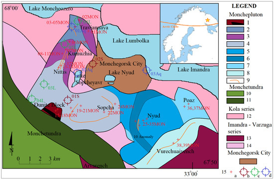 Geological Sketch of the Monchepluton intrusion (generalized, based on [3,4,23]). Abbreviations: Monchepluton—1. Dunites and chromitites, 2. Harzburgites, 3. Other peridotites, 4. Orthopyroxenites, 5. Olivine norites, 6. Gabbro-norites, 7. Gabbro, 8. Gabbro–anorthosites, 9. Massive sulfide mineralization; Monchetundra—11. Gabbro-anorthosites, and 12. Peridotites; Kola series—12. Archean gneisses; Imandra Varzuga series—13. Hypersthene diorites, 14. Metasediments, and metavolcanites; 15 sample localization: a—rock, b—soil, c—plant, and d—water.
