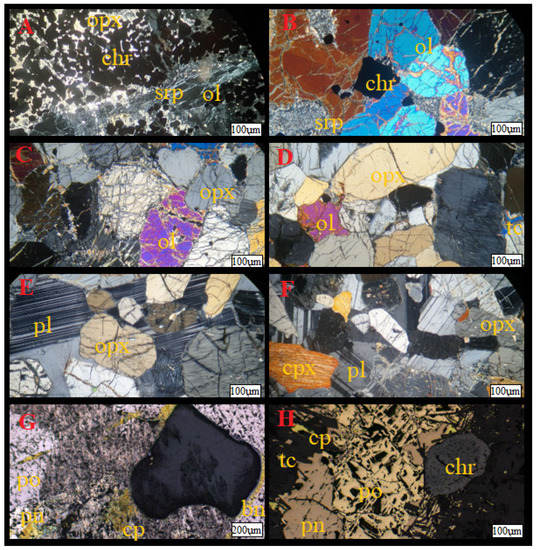 Microphotograph of the selected rocks types ((A–F) polarizing microscope, (G,H) reflected light): (A)—chromitite with chromite (chr) crystals on the orthopyroxene (opx) and serpentinized (srp) olivines (ol); (B)—dunites with zonal olivines and chromites and serpentine; (C)—harzburgites with orthopyroxene and olivine; (D)—orthopyroxenites with talc (tc); (E)—norites with orthopyroxenes and plagioclases (pl); (F)—gabbronorites with ortho- and clinopyroxenes (cpx) with plagioclases; (G,H) sulfide ores with pentlandite (pn), pyrrhotite (po), chalcopyrite (cp), and sometimes with bornite (bn) accompanied by crystals of talc and zonal chromite.