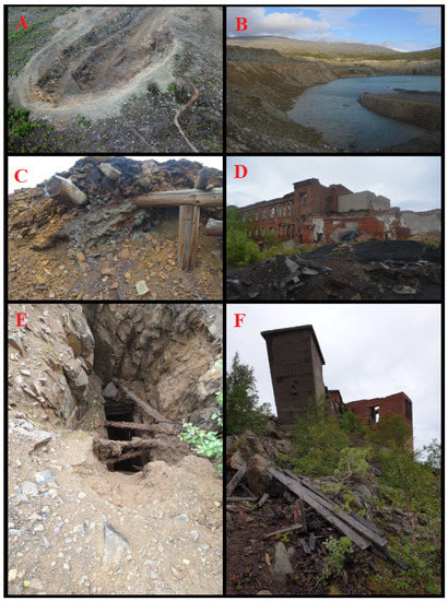 Photographs from the site, showing various traces of mining activity in Monchepluton: (A)—stone quarry in Nyud area with visible mining levels; (B)—chromitite quarry in Dunite Block with acidified flooded level; (C)—shaft and collapsed adit with visible precipitates; (D)—ruined outbuildings; (E)—unprotected shaft; (F)—ruined mine shaft.