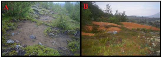 Photographs of soils from the Monchepluton area: (A)—initial soils based on regolith in the Kumuzhia area; (B)—a weathering cap over a chromite occurrence.