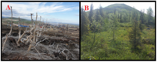 Examples of vegetation in the Monchepluton area: (A)—destroyed forest in the Sopcha area; (B)—forest–tundra in the Vurechuaivench area.