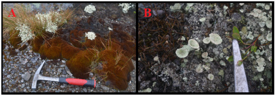 Examples of photographs of lichens from the study area: (A)—lichens of cladonia sp., in the vicinity of a clump of mosses and grasses; (B)—the lichen Cladonia chlorophaea.