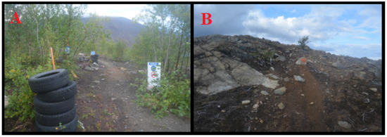 Examples of field trail delineation by residents’ initiative: bike trail marked with used tires (A) and paint-painted markings on rocks (B).