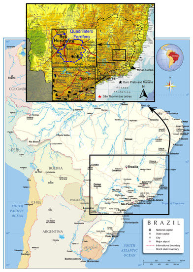 Location of the slopes in Minas Gerais state, Brazil (modified from nationsonline.org (accessed on 22 October 2022).