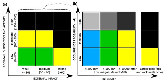 Another method focused on urban areas was proposed by [8]. This method evaluates the rockfall hazard for the Bavarian Alps, which takes into account the occurrence probability and the intensity of potential events. It is based on geological-geotechnical data collected in the field and observations. The rockfall probability is related to structural conditions of the slope; to the geomechanical environment, that considers parameters related to the rock mass displacement; and to the activity indications and the external influences, as precipitation and seismic zones. The intensity is related to the volume of failed material is due to the rockfall event. The method is easy-to-use, and it is applicable in urban areas located in mountainous regions.