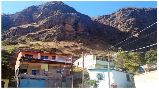 Slope-1 (Cabanas neighborhood) consists of a quartzite of the Itacolomi Group. Two areas (PR1 and PR2) were selected for the study due to their geomechanical and structural conditions. These areas have discontinuity planes along the entire slope surface; however, the direct measurement of the parameters at the field is limited to accessible points. These areas are prone to rockfalls, which can reach the buildings below the slope (Figure 3).