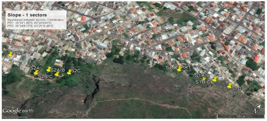 Areas (PR1 and PR2) and sectors of the slope in Cabanas (Google Earth, accessed on 16 December 2016).