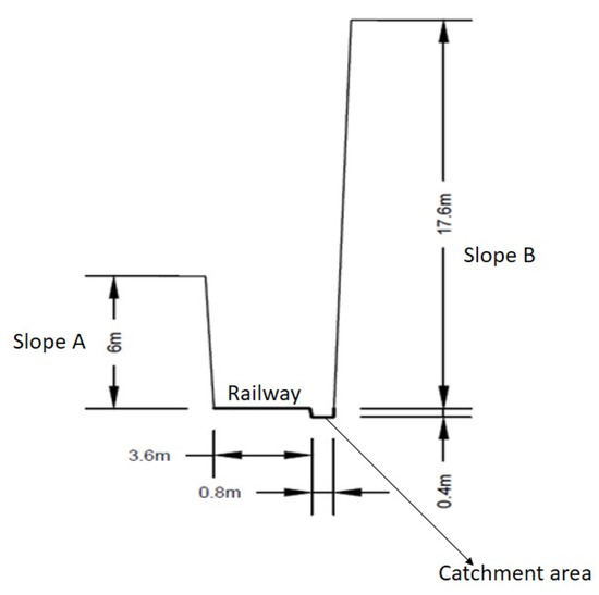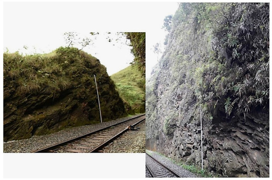Slope-2 (railway between Ouro Preto and Mariana) consists of schist of the Sabará Group. This slope is homogeneous along its extent of 35 m. During the railway construction, slopes were cut on each one of the two sides of the railway, named A (Figure 5, left side) and B (Figure 5, right side). Slope A is 6 m high, and Slope B is 18 m high. Only Slope B has a catchment area, with 0.80 m of width and 0.40 m of depth (Figure 6). This catchment area was not designed to catch the falling blocks; it is related to the amount of ballast used to build the structure. In the images of the slopes, a level staff (4 m) was used as scale.