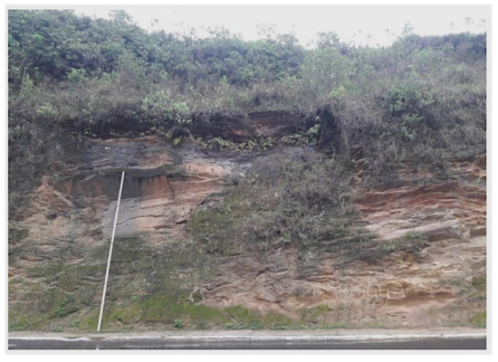Slope-3 (Vila Aparecida neighborhood) consists of schist of the Sabará Group. The slope height is 6.5 m. It is homogeneous and has no catchment area; the sidewalk is just below the slope toe (Figure 7). In Figure 7 a level staff of 4 m was used as a scale for the slope.