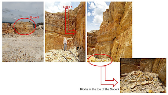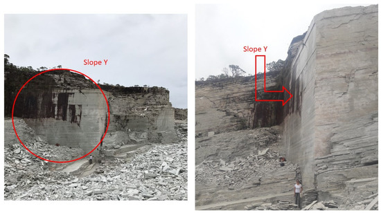 Slopes of a quartzite mine, located in São Thomé das Letras town (Brazil) were chosen in order to validate the proposed method. Its application to mine slopes constitutes a challenge and could indicate if the method can be used in other types of slopes. The mine was selected because it presents slopes prone to rockfalls. Two slopes were chosen for validation; one of them had its access prohibited due to the instability caused by rockfalls (Slope X) and the other presented good structural conditions and no activity indications, being considered stable (Slope Y). Slope X and Slope Y are shown in Figure 8 and Figure 9, respectively.