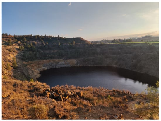 The possibility of exploiting these areas, apart from the economic benefits, also directly impacts the environment, as the main problem in the areas of the old mines is related to acid drainage. Much research has been carried out to study and restore these areas [1,2,3,4], where restoration by phytoremediation using low-pH-resistant plants is suggested in [2]. However, rehabilitation, apart from being a long-term process that helps to restore the landscape to its natural form visually, does not solve the problem of heavy metal contamination of water [3]. The old Mathiatis mines are one such case of mines that started to operate in the 1930s (1936–1938) and were abandoned in the 1980s, leaving behind open-pit mining (Figure 1) and piles of disposed waste material with or without mineralisation [2,3]. One of the major problems of these piles is the accurate estimation of their volume since usually there are no data on the area topography before mining began.