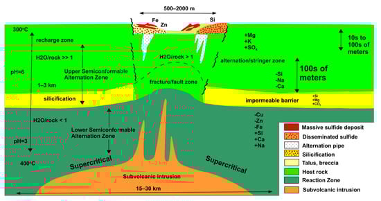 - Gibson, H.L.; Franklin, J.M.; Gibson, H.L.; Jonasson, I.R.; Galley, A.G. Volcanogenic Massive Sulfide Deposits. In Economic Geology 100th Anniversary Volume; Society of Economic Geologists: Littleton, CO, USA, 2005. [Google Scholar]