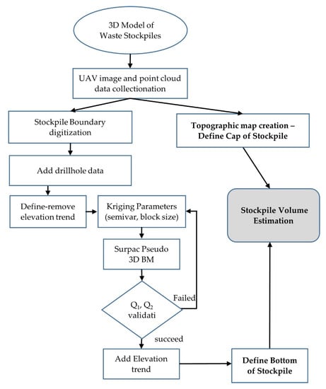 The bottom and top DTM surfaces were combined to create the 3D solid model of the stockpile and its volume estimation. This methodology is best described in the flow diagram of Figure 4.