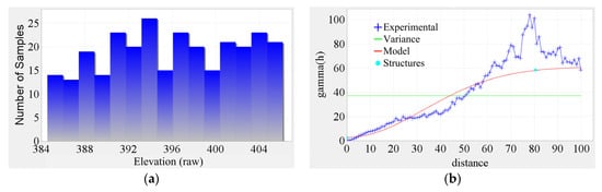 (a) Histogram and (b) experimental semivariogram of raw elevation data.
