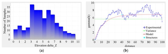 Histograms of 278-point elevations were constructed to check the data distributions and proceed to experimental semivariogram plots. The first attempt at raw data values presented a Gaussian distribution histogram plot (Figure 8a). However, the relative semivariogram plot (Figure 8b) presented a trend towards the greater values for the range, and a Gaussian mathematical model was calibrated on it. This trend can be observed in the experimental semivariogram shape (large sill values versus variance presented with a green line in Figure 8b). Several attempts in GEOVIA Surpac were made to check for an anisotropy on the data [42,43]. Due to the small number of data and since the software uses search ellipsoids that are cones with angle values less than 30°, their number became so small that it was impossible to build directional variograms.