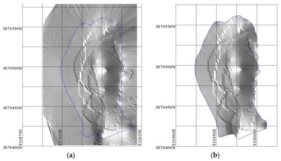 After the validation of the final model, the estimated values were back-transformed into “real” elevations into each block’s centroid. Northing, easting, along with this elevation, were used to construct the bottom STK1 surface, as shown in Figure 13a. This surface also contains elevation values estimated from extrapolation data, which are high uncertainty values. These values are removed when cutting the surface with the boundary that was digitised from the point cloud UAV data (Figure 13b).