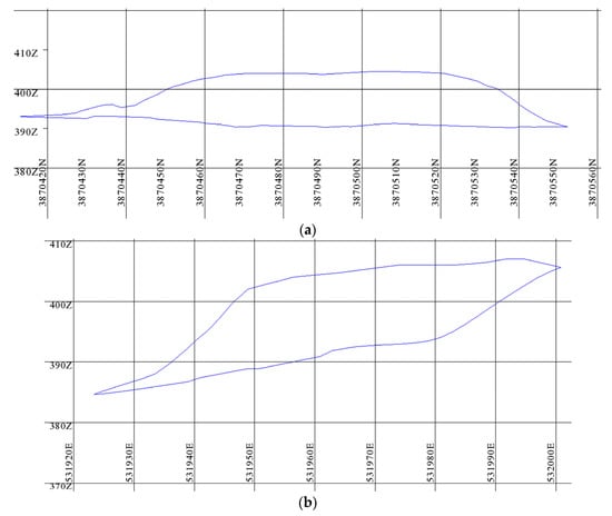 Stockpile STK1 sections in the (a) north–south direction and (b) west–east direction.