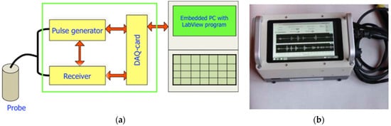In recent years, several researchers have utilized the RBT (Rock Bolt Tester) instrument to study rock bolts nondestructively (Figure 3b). RBT is a portable instrument capable of generating and recording guided waves and an embedded digital computer for signal processing, operator communication, and data storage [15]. Stepinski et al. evaluated the use of RBT for inspecting 65 rock bolts [15]. As shown in Figure 3a, the instrument consists of a pulse signal generator, signal receiver, and DAQ card for digitizing analog signals to communicate with a computer. The pulse generator can produce two different types of pulses (compressional and quasi-flexural) which then travel through the rock bolts and reflect back. The reflected signals are detected by the receiver, then passed through a signal conditioner and data acquisition board, as shown in the Figure 3a. The authors conducted approximately 3200 tests on 65 rock bolts over the span of 37 months. According to the authors, the RBT instrument provided reliable estimates for the length of the rock bolts and successfully located artificially introduced voids in the grout. However, a rock bolt means wave velocity of 3000 m/s was assumed in the calculations.