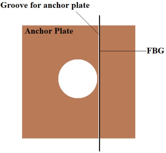 Sui et al. used the fiber Bragg sensor in the anchor pate where a 2 mm V-shaped groove was created to attach the sensor using adhesives as shown in Figure 7 [20]. The load experienced by the rock bolt anchor plate was calculated and it was demonstrated that the sensor in the anchor plate can measure the loading level past the yielding point of the plate itself.