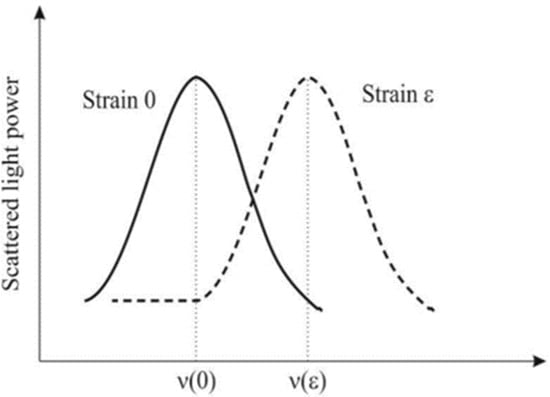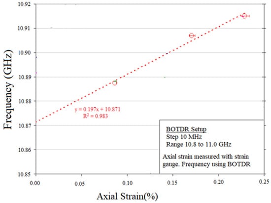 Furthermore, other researchers like Ricardo et al. have made use of a different type of fiber optics sensor known as BOTDR (Brillouin Optical Time Domain Reflectometer) [21]. Unlike the fiber Bragg sensor which measures the wavelength of the reflected Bragg wavelength, BOTDR measures the change in frequency of light that travels through the optical fiber as the optic fiber is subjected to strain. Traditional strain gauges were used by these researchers to measure the change in the strain which they correlated with the data from the BOTDR sensor as shown in Figure 8. A linear relationship was observed between the frequency and strain with a slope of 0.5. Figure 9 shows that the frequency of light increases with an increase in strain on the fiber optic cable.