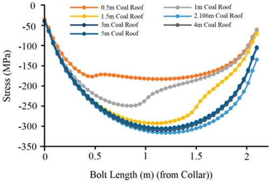 Figure 11 explains that the tensile strength is the maximum at the center of the bolt length between the top and the bottom. Additionally, hence, the decision of fully or partially grouting the rock bolt matters in order to minimize the failure of the rock bolt due to stress corrosion cracking.