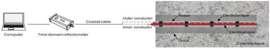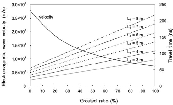 Jung et al. studied the application of electromagnetic waves for monitoring the health of soil nails [26]. Soil nails are similar to steel studs, but they are installed in soil slopes for stability. Rock bolts are generally pre-stressed whereas soil nails are not. A time-domain reflectometer (TDR) was used to generate electromagnetic waves and experiments were conducted on steel bars (partially grouted, fully grouted, and not grouted). The setup for this research is displayed in Figure 12. It was observed that the method of using electromagnetic waves for monitoring the health of installed soil nails can be useful. Furthermore, it was noticed that the velocity of the electromagnetic wave decreases with the increasing percentage of grouts present in the steel bar (Figure 13).
