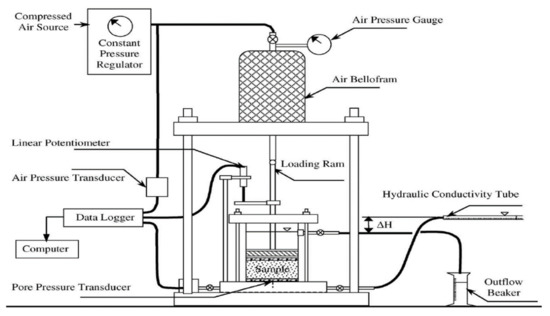 Schematic of the controlled hydraulic gradient consolidation test apparatus (Reprinted from permission from Lowe et al. [83]. 2023, Copyright Clearance Center, Inc.).