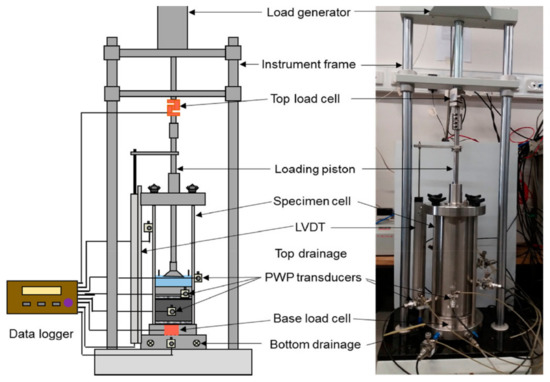 In this testing approach, the test specimen is deformed at a constant rate by applying a specified constant rate of deformation of the base plate with the axial load press. During the test, the pore water pressure at the base of the test specimen, the axial deformation, and the axial load are measured at each interval. In this apparatus, the consolidation ring can accommodate a test sample of 20 up to 50 mm in height from a very soft state with a high moisture content of 100% or more [78,79]. Presumably, the height restriction is to ensure a diameter to height ratio greater than 2:1 to minimize wall friction.
