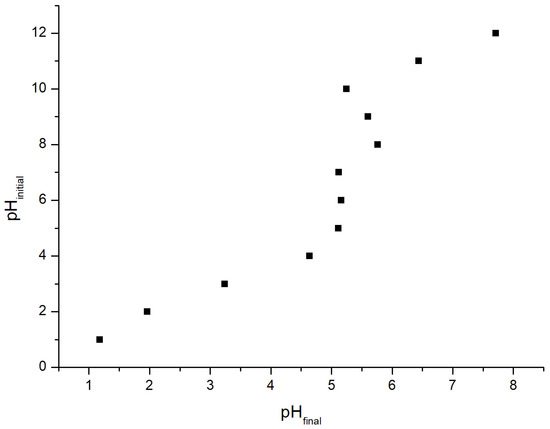 The pHCZ was 5.1, as indicated in Figure 2, which means that, in solutions with pH lower than this value, the adsorbent surface presents a positive charge, and at a higher pH value it has a negative charge. This value was similar to the results obtained by other authors, with pHCZ equivalent to values lower than 7 [24,58]. The UC presented a wide range of pH values above the pHCZ, indicating that it has favorable characteristics for interaction with cationic dyes, such as MB, CV, and BF [11,24,58]. The industrial conditions of UC production lead to acid functional group formation, such as carboxylic, lactonic, phenolic, and acyls in acid anhydrides, and neutral groups, such as carbonyl functional groups on the UC surface, as indicated by the FTIR analysis, which confirms its ability to interact with positively charged molecules [16].