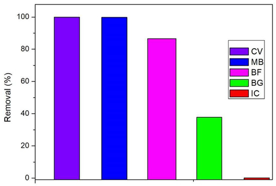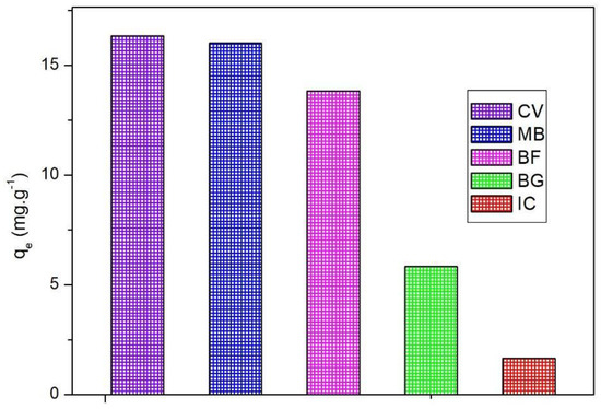 Figure 3 and Figure 4 present the adsorption capacity and removal of industrial dyes, which show results in the following order: IC (1.66 mg/g) < BG (5.84 mg/g) < BF (13.83 mg/g) < MB (16 mg/g) < CV (16.34 mg/g). It is possible to notice that the UC allowed the more efficient removal of cationic dyes, such as CV, MB, and BF in accordance with the information presented by the pHCZ analysis. However, there is a difference between the values obtained for these dyes, and this behavior may be associated with molecule dye dimensions, as well as the charge effect indicated previously by the PCZ study [24]. As reported by the literature, CV adsorption occurs through a bond between dye and oxygen atoms present on SiO2 and Al2O3 [59], which, as reported by FRX analysis, were the major mineral compounds present in the UC. Reported adsorption capacity values were in the range of 33.46 to 80.36 mg/g for CV when applying an adsorbent material similar to UC. The difference between these values and those observed in the present study may be related to the employment of higher temperatures in the literature [58]. With regard to the MB adsorption onto UC, the literature has reported values near 79.96 mg/g, and the difference between this value and the one obtained in the present study may be related to the gasification conditions, which play an important role in adsorbent properties, such as surface functional groups, pore volume and size, surface area, and others [60,61]. The literature has indicated adsorption capacity values of BF in the range of 7.16 to 34 mg/g by material with similar properties to UC [51]. The values obtained for BG and IC are in agreement with values reported by other authors and may be related to the anionic nature of these dyes [62].