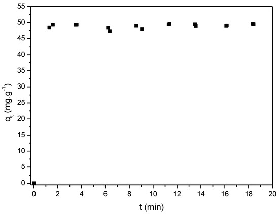 Figure 5 presents the kinetic data, which indicates that the first step of the adsorption process is characterized by a fast increase in dye adsorption capacity within the first five minutes. According to the literature, this may be related to the occupation of available adsorption sites at the beginning, which leads to a higher difficulty for other dye molecules to be adsorbed due to repulsion forces between the adsorbent and the dye surface [63]. Considering the high adsorption rate, it is possible to assume that the process adsorptive was determined mostly by the mass transfer mechanism convective, which was confirmed by the kinetic model fitting (Table 7). It is possible to observe that the adsorption capacity at equilibrium was equal to almost 50 mg/g, which is lower than the value obtained by Wang et al. [58] and must be related to the adsorbent dosage since the adsorption capacity may be related to the availability of adsorption sites.