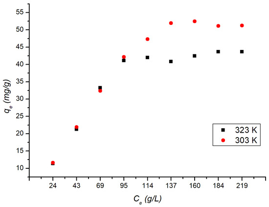 The adsorption studies were conducted at two different temperatures, 303 and 328 K to evaluate the influence of temperature on the adsorption process; the experimental data are shown in Figure 6.