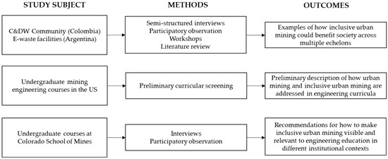 To answer the questions that were raised in this work, we propose some additional areas for future research. First, there is a need for a deeper analysis of the US and Latin American science engineering curricula to understand the lack of urban mining content and identify synergistic opportunities with overseas academic entities. Second, further work needs to be undertaken to screen current educational programs in the US since our study is limited. Third, future efforts within the engineering education field should be focused on developing an outline of an Inclusive Urban Mining course with the insights from this research that could be then included in the US engineering programs. Fourth, additional topics that should supplement the study of inclusive urban mining should be identified. Some topics that we believe could be beneficial to include are understanding the material politics of what is traditionally viewed as “waste” as well as learning social science approaches, such as contextual and empathetic stakeholder engagement strategies, to properly understand cities and their context.