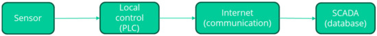 Due to the nature of underground mining operations and limited accessibility, data was collected using different methods. Communication between the surface and underground was made possible through remote communication technologies [22]. This system architecture involves inner control loops managed by a network of local programmable logic controllers (PLCs) and an outer control loop managed by a central supervisory, control, and data acquisition (SCADA) system. This ensures complete control and monitoring of the entire PLC network, making it a popular technology for data acquisition in underground mines [23,24]. Figure 3 illustrates the data flow process from SCADA sensors to the SCADA database.