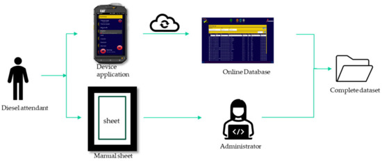 In parts of the case study mine where SCADA was not available, data were captured on a mobile application via a diesel bay attendant and then synchronised with a centralised online database. To ensure the completeness and accuracy of the data, diesel attendants were also required to manually capture the data on diesel control sheets that were handwritten (also useful for backups). Figure 4 illustrates the manual data collection procedure. Here, a mobile application was used for capturing data and a manual sheet was used in parallel to avoid data loss. The two systems were compared to verify the dataset.