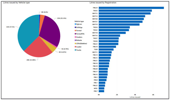 Figure 5 also shows a clustered bar chart (Figure 5, right) which indicates the diesel issued per vehicle registration. This representation enabled managers and stakeholders to visualise a specific vehicle’s consumption, with the top vehicle being the highest consumer and the last being the lowest consumer.