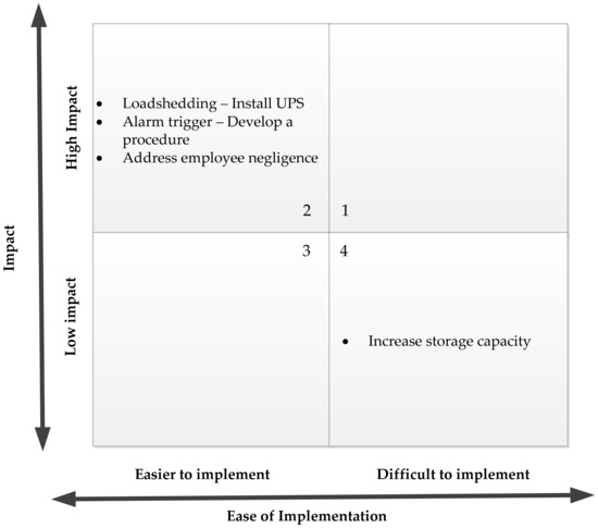 In the previous section, root causes of diesel spillages in an underground mine were determined. These causes were identified in order to expand the DIKW hierarchy and enable effective management of underground diesel wastage. Upon identification of the root causes, the study developed a priority matrix to prioritise solutions with the highest impact on the diesel-loss problem experienced in underground mines. In Figure 7, the second quadrant indicates the solutions that are high impact and easier to implement. These solutions can be implemented within a short timeframe. The fourth quadrant indicate solutions with a low impact and high difficulty to implement.