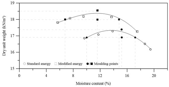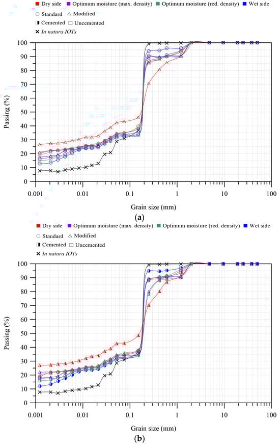The gradation was evaluated through sedimentation and sieve analysis following ASTM D7928 []. The Atterberg limits and the specific gravity were analyzed following ASTM D4318 [] and ASTM D854 [], respectively. According to the Unified Soil Classification System [], the studied IOTs can be classified as silty sand once non-plastic and around 83% of their particles are in the silt-size range. Figure 1 depicts the compaction characteristics obtained using the standard ASTM D698 [] and the modified ASTM D1557 [] Proctor compaction efforts.