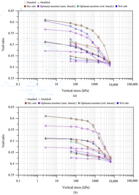 The one-dimensional compression tests agreed with the procedures stated by ASTM D2435 [] using a setup composed of a consolidometer, a load device, and a linear variable differential transformer (LDVT) used to measure the vertical displacement. Porous discs and filter papers were utilized at the bottom and top of the testing ring to permit the drainage of the compacted specimen during the loading stages. After applying a setting stress of 5 kPa, the loading schedule was: 50 kPa, 100 kPa, 200 kPa, 400 kPa, 800 kPa, 1600 kPa, 3200 kPa, and 6400 kPa.