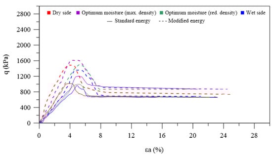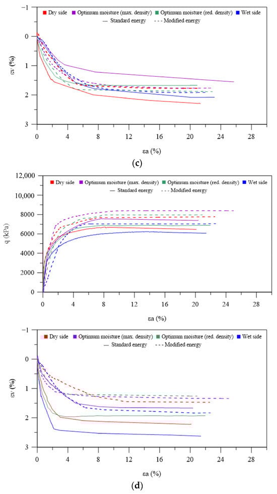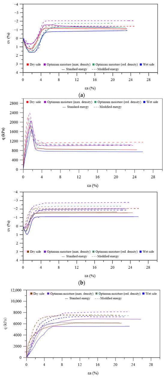 Considering the lowest confinement level, all specimens have shown an initial brittle response, presenting well-defined peak stress, followed by post-peak strain softening. This was accompanied by an initial contraction, followed by a dilatative trend. For the uncemented samples, the peak stress coincides with the highest dilation rate, which is the typical response of purely frictional granular materials. This was not the case for the cement-containing specimens [,]. For both cemented and uncemented samples, the top deviatoric stress (qmax) was proportional to the molding void ratio when considering the optimum molding conditions at standard and modified compaction efforts (i.e., γdmax and wopt). Moreover, slightly higher strengths were obtained for the specimens molded at the optimum moisture content but with reduced dry unit weight, followed by the dry side samples and, ultimately, the wet side ones. The addition of cement has also led to a substantial increment in the strength and pre-peak stiffness of the samples, has augmented the dilation rate, and has enhanced the brittleness. This suggests that the cement bonds have remained intact during the consolidation phase up to the attainment of p’0 = 300 kPa []. In other words, the cement bonds were responsible for the reported strength and stiffness gains as they only degraded during the shearing [,].